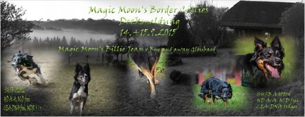 | Magic Moon's Billie Jean / SHBS-Nr. 692092, tricolor, Schulterhöhe = 51 cm, HD A/A, OCD frei, DNA-CEA-Genotype normal, PRA + KAT. frei, MDR +/+, HGH 1, Agility L3 | Bye and away Gloubard, SHB-Nr. 121173, tricolor, langhaar, Schulterhöhe = ca. 52 cm, HD A/A, OCD frei, DNA-CEA-Genotype Träger, PRA + KAT. frei, HGH 2 |